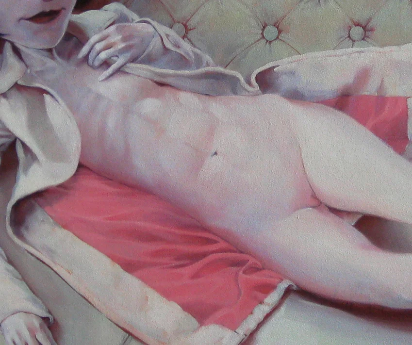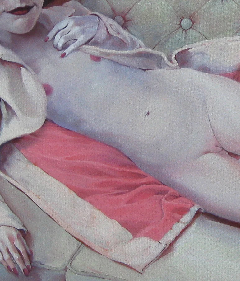 That weird crease on her left side is actually in the reference. Sort of. Her ribcage is twisting back towards the couch and compressing with the hip at the same time. So as her torso twists, her oblique externals (those are that set of muscles) are flexing to make that movement happen. They are in no way that severe looking, but I was caught up in trying to make everything exactly as it was in the picture and in doing so I managed to over-amplify everything. Well done.