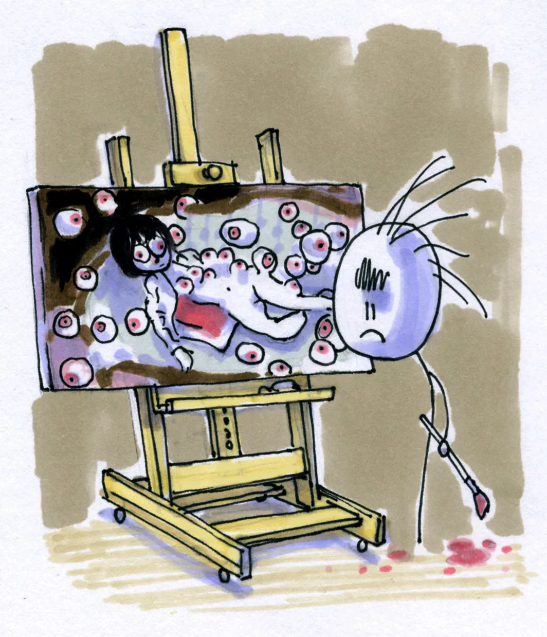 Painting flat white skin has no subtlety so usually I start with a traditional orange-y base and start layering yellows and blues and pinks over the top. Hopefully this will allow small parts of all of those colors to show through the top coat of white, giving the skin a thin translucent feel. This rarely ever happens for me, but I always give it my best fucking shot anyway because I'm a champion.